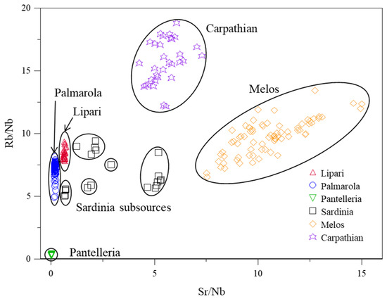 Lipari obsidian may be distinguished from other Mediterranean sources using graphs with Rb/Nb vs. Sr/Nb ratios, and the specific concentration of strontium distinguishes between the Lipari subsources of Gabellotto Gorge and Canneto Dentro [16,39,40,45]. Careful comparisons of other sources using the data for all individual elements were performed.