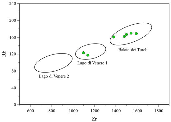 Zr and Rb values in ppm for Valdesi artifacts (green) showing the Pantelleria subsources.