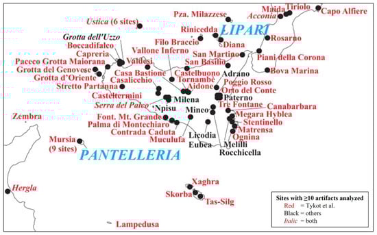 Sicily sites with 10 or more artifacts tested. Obsidian sources are Lipari and Pantelleria. The blue are the source islands.