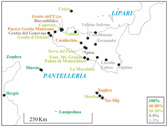 Pantelleria obsidian decreases with distance, with little in eastern Sicily. Not shown are the 22 sites with no Pantelleria obsidian.