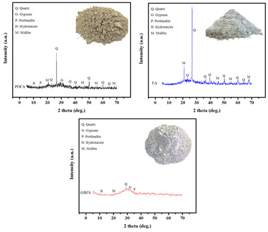 X-ray diffraction (XRD) is non-destructive technique used to obtain the differentiation between the crystalline and amorphous phases in the materials. The test provides information especially on structures, phases, preferred crystal orientations, and structural parameters. In this study, a Siemens Diffractometer D5000 with X-ray source of Cu Kα radiation was used. The scan step was 0.02° using a scanning rate of 0.5 °C/min and in the range 2-theta-scale from 5 to 70 degrees. From each raw material (POFA, FA, and GBFS), 5 mg of powder was collected for this test. Figure 2 shows the XRD profiles of POFA, FA, and GBFS. Both POFA and FA showed intense XRD peaks at 2θ = 15.3–29.8°, which were due to the crystalline phases of SiO2 and Al2O3. These prominent XRD peaks correspond to the crystalline phases of quartz (SiO2) and mullite (3Al2O32SiO2 or 2Al2O3 SiO2). GBFS (containing reactive SiO2 and CaO) showed strong amorphous phase without any intense XRD peak, indicating its prospective for the production of GPMs. Nevertheless, POFA and FA were incorporated in the mortars as substitutes to GBFS to surmount the low concentration of SiO2 (30.8 wt.%) in GBFS.
