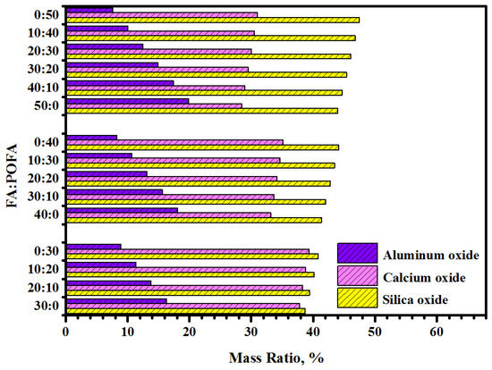 The influence of high CaO content on the geopolymerization mechanism of the produced 15 mortar mixes were assessed (Table 2). The CaO content was improved by increasing the GBFS content (50, 60 and 70%) in the GPM blend. Then, FA and POFA were used to replace GBFS in the GPMs. Figure 4 depicts the various effects of GBFS, FA, and POFA contents on the CaO mass ratio, wherein with the increase in GBFS level from 50 to 70%, the CaO concentration increased from 28.5 to 37.8%, respectively (Figure 4). In addition, the SiO2 content enhanced by decreasing the GBFS level and increasing the POFA content. Aside from that, the concentration of Al2O3 improved by increasing the FA content. All the mixes in every batch were made with the same molarity of NH (4 M). The proportion of POFA, FA, and GBFS (binders) to fine aggregates (B:A) were maintained constant at a 1:1 ratio. All GPMs had a constant ratio of NS to NH wherein the alkaline activation containing Na2SiO3 and NaOH amounts was correspondingly 171.43 and 228.57 kg/m3. The ratio of alkaline activator solution to ternary binder of geopolymer mix was fixed at 0.40. The obtained mortar mixes were analyzed using diverse measurements to evaluate the effects of high GBFS level on their durability performance and slant shear bond strength (SSBS).