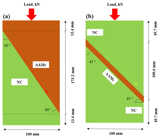 Several methods were used to evaluate the bond strength between normal concrete substrates and proposed GPMs including the slant SBS, three- and four-point flexural strength (FS), and splitting tensile strength (STS). In the first method, for the half slant shear specimens, the hardened normal concrete was slanted diagonally at an angle of 30° from the normal. As per ASTM C882, the suggested bond angle of 30° represented the failure stress that corresponded to a flat surface close to the least stress (Figure 5). Additionally, the composite cylinders with slant shear of 45° were also prepared and evaluated for this purpose. In the second method, the dummy sections of the normal concrete cylinder were bonded with GPMs at an interface thickness of 10 mm and slant of 45°. After that, it was compressed using compression machine (3000 kN capacity NL Scientific) and tested at ages of 1, 3, 7, and 28 days. The impact of high levels of GBFS and POFA as FA replacement on the slant SBS was also evaluated. At every curing age, the mean value of the tested 3 mixes was calculated.