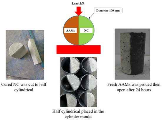 An STS test of the prepared cylindrical composite materials was performed to determine the bond strength between GPMs and cement mortar substrate. The effect of POFA as an FA replacement incorporating high volumes of GBFS on the SBS of the mortar mixes was examined under the tensile strength. The tensile strength test is performed to measure the slant shear strength amid the normal concrete and the proposed mortars. Specimens are prepared by cutting the cylindrical normal concrete and forming half cylindrical specimens. Next, the half cylindrical normal concrete is placed in cylinder mould and then the fresh GPMs are poured (Figure 6). Samples are opened after 24 h and tested at ages of 1, 3, 7, 28, and 56 days. The test is conducted using compressive machine with loading rate of 2.5 kN/s.