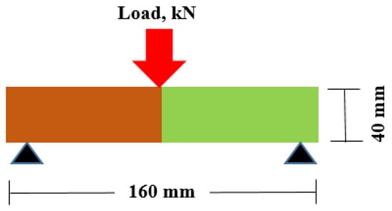 The FS test was conducted to evaluate the bonding strength between the normal concrete and GPMs. For this test, three types of specimens are prepared. The first type of specimen is casted using OPC mortar in the form of prisms with dimensions (40 × 40 × 160) mm. After curing, they were cut into halves and then placed in steel prism mould, where the fresh GPM is poured and tested under three-point load method at ages of 1, 3, 7, 28, and 56 days. Second type of sample was made from C40 (40 Mpa) with dimensions (100 × 100 × 500) mm. It is then cut from the middle with width 35 mm and then casted in the prism mould by pouring freshly made mortars. These casted specimens were tested at ages of 1, 3, 7, 28, and 56 days under four-point load at loading rate 0.2 kN/s. The procedure for testing the two types of specimens is illustrated in Figure 7 and Figure 8, respectively.