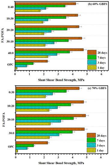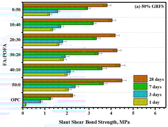 The effect of high volume GBFS on the slant shear bond strength was assessed. Figure 9a–c depicts the 30° slant shear load carrying capacity of OPC substrates and GPMs. The slant shear values were between 4.5 and 5.2 Mpa, with increasing GBFS from 50 to 70%, as replaced with FA. At an early age (1 day), the increasing GBFS level from 50 to 70% with FA led to an increase in the bond strength from 2.1 Mpa to 2.4 and 2.6 Mpa, respectively. At every GBFS level, the bond strength values dropped slightly when the FA was replaced by POFA. Similar trends in results were observed at ages of 3, 7, and 28 days, which showed that the bond strength was positively influenced by increasing the GBFS content from 50% to 60 and 70%. At 28 days of curing age, the results showed that the increasing GBFS content from 50% to 60 and 70% led to an increase in the bond strength values from 4.5 Mpa to 4.9 and 5.2 Mpa, respectively. At 50% of GBFS, the inclusion of 10, 20, 30, 40, and 50% of POFA as an FA replacement led to a decrease in the bond strength values from 4.5 to 4.3, 4.15, 3.9, and 3.84, respectively. In high volumes of GBFS containing alkali-activated mixtures, the mixes prepared with FA exhibited significantly higher shear bond strengths than the mixes prepared with POFA. This indicated that the alkali-activated binders containing FA produce the C-S-H gel higher than the binder containing POFA. This could be due to the low content of silicate non-reactivity. However, all the GPMs achieved a bond strength much higher (almost double) than the OPC specimens.