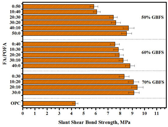 The results of the 45° slant shear test are shown in Figure 10. An increase in the GBFS content from 50 to 60 to 70% resulted in an increase in the bond strength values from 8.5 to 9.1 to 9.6 MPa, respectively. Furthermore, the SBS dropped with the increasing replacement of FA by POFA. Increasing the level of POFA in the GPMs as a substitute to FA was found to affect the silicate and alumina levels. Thus, an increase in the silicate and a reduction in the aluminum content led to an increase in the non-reacted particles and negatively influenced the bond strength [41]. The results of 30° and 45° slant shear bond strength for all alkali-activated mixtures displayed excellent outcomes compared to the control samples of normal OPC mortar, in which case the exterior bond zone failed.