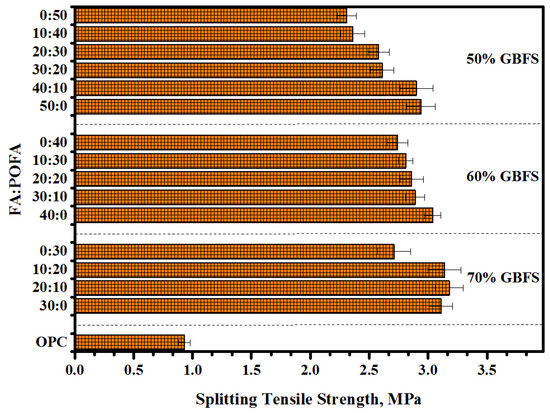 The bond strength between NC and high volume GBFS mortars was evaluated using splitting tensile strength. The results for the bond strength at an age of 28 days are shown in Figure 11. All the GPMs showed excellent SBS compared to the control sample (normal OPC substrate), wherein their values enhanced (from 2.94 to 3.11 MPa) with increasing GBFS levels (from 50 to 70%). Similar trends were found with GBFS-replaced POFA, where the bond strength increased from 2.31 to 2.73 MPa with the corresponding increase in GBFS from 50 to 70%. It was observed that the GPMs containing FA revealed a higher bond strength compared to POFA mortars. Furthermore, the SBS was reduced by increasing the POFA replacement with FA at various levels of high volume GBFS-containing alkali-activated matrices. Ranjbar et al. [29] reported that an increase in the POFA to FA percentage ratios resulted in an augmentation in the SiO2/Al2O3 ratios. Thus, the presence of a high SiO2:Al2O3 ratio restricted the C-S-H gel product formation and reduced the GPMs performance.