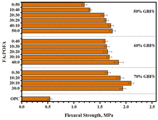 Figure 13 displays the results of the three-point load FS of GPMs. All the prepared GPMs revealed excellent bond strength between 4.37 and 5.36 MPa, as compared to the OPC control sample (1.74 MPa). Similar trends were evidenced for the SBS of GPMs, which increased with increasing GBFS contents as a replacement of FA or POFA.