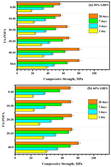 Figure 14 shows the effect of high volume GBFS on the CS of the prepared mortars. An increasing content of GBFS showed a positive effect on the compressive strength. Figure 15a displays the influence of GBFS replacement with FA. As the GBFS levels increased from 50 to 70%, the early age (1 day) strength of the mixes also increased from 38.71 to 40.1 MPa, respectively. Similar trends in compressive strength developments were observed at ages of 3, 7, and 28 days. The test results of CS were 80.5, 80.7, and 85.1 MPa at an age of 28 days, when the corresponding levels of GBFS increased to 50, 60, and 70%. The CS gain of specimens containing high volumes of GBFS were 45, 61, 75, and 90% from the final strength at 1, 3, 7, and 28 days, respectively. Figure 15b shows the effect of increasing the GBFS levels by replacing them with POFA on the CS development of GPMs. The observed CS values were directly proportional to the GBFS levels including POFA. The early strength of the mortars after 24 h improved with the increase in GBFS levels and a reduction in POFA contents. The CS values of the mortars increased from 18.7 to 26.0 MPa with the corresponding increase in GBFS levels from 50 to 70%. The CS at other ages revealed similar trends to early age curing. The CS values varied from 55.6 to 70.5 MPa at 28 days. The specimens prepared with high volumes of GBFS as a substitute to POFA displayed a gain in the CS, ranging from 29 to 78% from the final strength at the ages of 1 to 28 days, respectively.