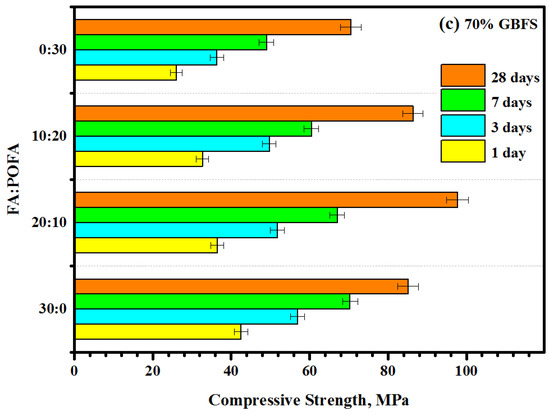 The effects of high volume GBFS on the CS of mortars at various ratios of FA:POFA are shown in Figure 14. The mortar mix made by using 70% GBFS showed a reduction in the ratio of FA:POFA from 30:0 to 0:30, and has negatively affected the strength gain at early ages of 1, 3 and 7 days, as shown in Figure 14a. The values of compressive strength were observed to be 42.5, 36.5, 32.7, and 26 MPa for POFA contents of 0 to 10, 20, and 30%, respectively. Low contents of Al2O3 negatively affected the early age strength of GPM [58,59,60,61,62]. At an age of 28 days, the CS increased from 85.1 MPa to 97.8 MPa with increasing POFA contents from 0% to 10% as an FA replacement. An increase in the POFA content from 20 to 30% reduced the strength from 86.5 and 70.5 MPa, respectively. The effect of POFA in place of FA on the CS of GPMs containing 60 and 50% of GBFS is shown in Figure 14b,c, respectively. With increasing POFA levels, the CS at early ages was reduced. Ariffin et al. [63] reported that the low contents of Al2O3 were responsible for the reduced compressive strengths, which were attributed to the incomplete geopolymerization reaction because Al2O3 showed a higher dissolution rate in early phases of the geopolymerization process.