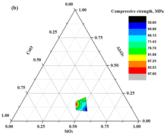 Figure 15 shows the effect of silica to aluminum (SiO2:Al2O3) and calcium to silica ratios (CaO:SiO2) on the compressive strengths of GPMs containing high volumes of GBFS. The compressive strengths of GPMs were appreciably influenced by the increase in such ratios. The highest strength (above 80 MPa) was obtained when the ratio of CaO:SiO2 was above 0.8 and SiO2:Al2O3 was below 3.5. However, the CS of the mortars was inversely related to the SiO2 to Al2O3 ratio with the optimal value of 55.6 MPa at the ratio of 6.5 (Figure 15a). The CS of mortar mixes at an age of 28 days reached a maximum value of 97 MPa for a CaO to SiO2 ratio of 0.97. SiO2 to Al2O3 ratios of 2.75 and 3.25 reduced the corresponding CS values of GPMs at an age of 28 days to 86.4 and 85.1 MPa (Figure 15b), respectively. It was demonstrated that as the silica percentage content increased and calcium and aluminium contents decreased, the compressive strength of GPMs reduced.