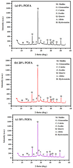 Figure 16 shows the influence of a high-volume GBFS (70%) incorporating FA and POFA at 28 days of curing age. An increasing amount of GBFS enhanced the albite peak intensity and reduced the quartz peak intensity. GPMs with increasing contents of GBFS (60 and 70%) and decreasing contents of POFA (40 and 30%) revealed new peaks, such as calcite and gismondine, in addition to the albite gel peak. The formation of dense gel product led to the enhancement of the GPM surface structure and strength from 63.2 to 73.1 and 76.9 MPa. The gel peaks verified the presence of calcium in chemical composites such as calcite, gismondine and albite for 0 and 10% of POFA replaced FA. The albite peak at 31° for 10% of POFA showed a higher intensity and lower width than a similar peak at 0% of POFA, implying that the C-S-H product in 10% POFA was higher than the one made without POFA. This explained the improved CS of mortars to 97.7 MPa compared to 85.1 MPa recorded without FOFA. When the POFA level in place of FA was raised to 20%, some of the peaks were altered, where a mullite peak replaced the calcite at 36° and nepheline replaced the ettringite peak at 34°, leading to a reduction in the strength of the GPM from 97.7 to 86.4 MPa [49].