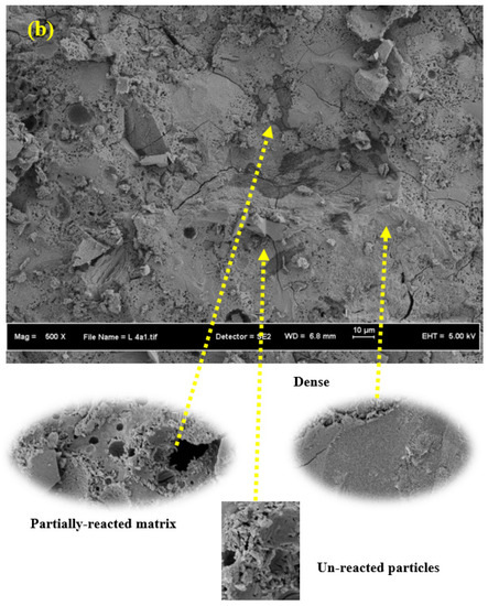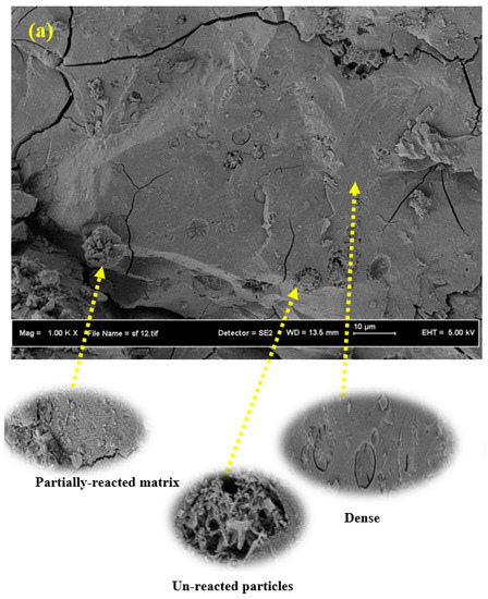 To compare the microstructure of GBFS blended mixes containing FA, three levels of high-volume GBFS specimens were prepared. Figure 17 presents the SEM results for 70% GBFS and POFA as FA replacement at 28 days of age. As seen in the SEM images, the dense gel increased with the increasing contents of GBFS. Generally, with the increase in GBFS level, the C-S-H gel products were also increased, thus enhancing the microstructures of the mortars [61,62,63,64]. Figure 17a shows the SEM image of GPM containing 70% GBFS. Most of the sample surface appeared dense in the presence of a small quantity of particles that did not react at all or reacted partially. Figure 17b shows the SEM images of mortar microstructures when FA was replaced by POFA at 70% of GBFS. With decreasing levels of GBFS, partially reacted and unreacted particles in the mortar increased, indicating a less compact and highly porous surface of the mortar than the one made with 70% of GBFS only. Furthermore, SEM images showed that the substitution of GBFS by 30% of FA could enhance the microstructures of the alkali-activated matrix wherein the mortar’s surface became less porous and more compact than the one made using 30% of POFA. The SEM image of the specimen composed of 30% of POFA displayed an abundance of FA particles that underwent a partial or no reaction. The non-reacted or partially reacted particles were rarely observed on the GPMs surface with a low amount of POFA. The CS and microstructures of the proposed GPM were found to rely mainly on the SiO2 to Al2O3 ratio [65], wherein a ratio over 3.50 was found to negatively influence the mortar’s CS and microstructures [66].