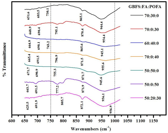 Figure 18 shows the FTIR spectrum of GPMs prepared using various GBFS levels (50, 60, and 70%). Mortars containing 50, 60, and 70% of GBFS showed significant IR bands at 755.3 cm−1, 871.5 cm−1, and 945.6 cm−1; 743.7 cm−1, 865.6 cm−1, and 945.1 cm−1; and 730.1 cm−1, 865.1 cm−1, and 944.4 cm−1, respectively. The observed reduction in frequency with an increase in GBFS content was responsible for the increase in the CS of GPMs from 80.5 to 85.1 MPa. The creation of hydration reaction products like AlO4, C-S-H, and C-(N)-A-S-H were inversely related to the wavenumber, wherein a small wavenumber suggested the dissolution of more SiO2, enabling the formation of more reaction gel products [67,68]. Comparable results were obtained for GPMs made with GBFS in place of POFA at 50, 60, and 70%, wherein an increasing GBFS content could reduce the band wavenumber. This observation was attributed to the production of more dense gels of C-S-H and C-(N)-A-S-H. The achievement of the GPMs low strength with POFA incorporation, rather than FA inclusion, was explained using a FTIR analysis. With increasing POFA concentration, the Al2O3 content in the mortar could be reduced with the dissolution of silicate and leads to a drop in the gel formulation. Consequently, AlO4, C-S-H, and C-(N)-A-S-H products were decreased, which showed that the wavenumbers of POFA-included mixes were different than the ones made with FA incorporation. The FTIR spectra of the mortar mix made with 50% of GBFS and POFA replaced by FA was also recorded. The wavenumber of Si-O-Al was enhanced with the increase in POFA content from 0 to 50%, in which case the corresponding CS values were reduced from 80.5 to 55.6 MPa.