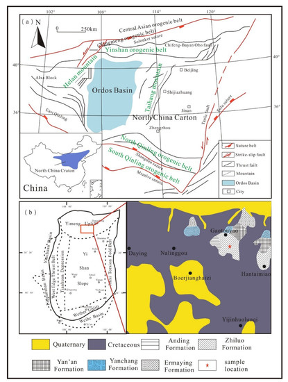 Map of the research area: (a) simplified geological map of north-central China [39]; (b) the division of tectonic units in the Ordos Basin and the regional geological map of the research area.
