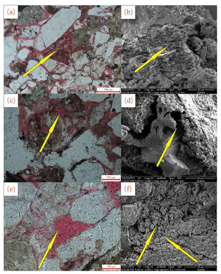 Microcracks can effectively connect various pores and improve the pore structure of sandstone [51]. Microcracks are rare in the study area (Figure 6), with an average surface porosity of less than 1%. The microcrack width is approximately 10–40 μm, and microcracks are commonly found in interlayer fractures, brittle mineral compression fractures, and irregular dissolution microcracks along the cleavage direction within feldspar and mica particles. Because mineral cleavage fractures are mostly closed at one end, although they provide a certain porosity improvement effect, their contribution to the permeability is minimal.