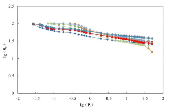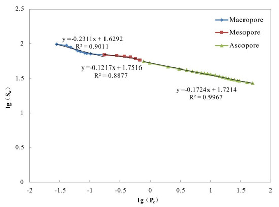 Through our analysis of the fractal structure characteristics and by fitting the correlation graph between lg (Sw) and lg (Pc) in the study area (Figure 9), we found that the linear fitting degree of the Zhiluo Formation sandstone is high and that the sandstone pore structure has good fractal properties. From our observations, as lg (Pc) increases, the degree of linear correlation increases, indicating that small pore throats have better fractal properties than large pore throats. From the lg (Pc)-lg (Sw) diagram (Figure 10 and Figure 11), it can be seen that the sandstone in the study area can be divided into two or three sections. The proportion of small pore throats is relatively high, while the proportions of large and medium pore throats are relatively low. When large pore throats are omitted, two sections can be identified.