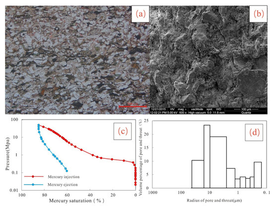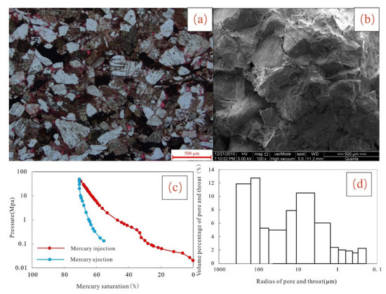 In our experiment, we selected a total of thirty-two sandstone samples from the Zhiluo Formation in the research area, including seventeen samples from section 1 and fifteen samples from section 2. This experiment included ordinary thin sections, cast thin sections, physical property analysis, mercury intrusion analysis, and scanning electron microscopy (SEM). The SEM analysis was completed at the Shaanxi Provincial Institute of Geology and Mineral Resources using an FEI MLA650 automatic mineral analyzer. The experimental steps were as follows: mechanical polishing, further polishing of the polished surface using an argon ion polishing instrument, pasting of a conductive film on the surface, sample vacuum pumping (gold spraying at 10–20 nm), and observation under a microscope. The remaining experiments were completed at the Open Research Laboratory of Mineralization and Dynamics of the Ministry of Land and Resources. The cast section was observed at the Open Research Laboratory of Mineralization and Dynamics of the Ministry of Land and Resources of Chang’an University in China with the ZEISS Axio imager D1m (Zeiss Group, Jena, Germany). The mercury injection experiment was conducted using an AutoPore IV 9510 (Micromeritics, Norcross, GA, USA) fully automatic mercury intrusion instrument, and each sample was processed into a cylinder with a height of 3 cm and a diameter of 2.5 cm. The method and data processing methods refer to GB/T 29171-2012 “Determination of Rock Capillary Pressure Curve”.
