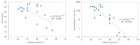 Relationship between the content of sandstone fillers and porosity permeability in the Zhiluo Formation.