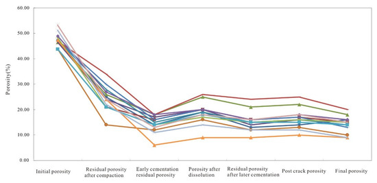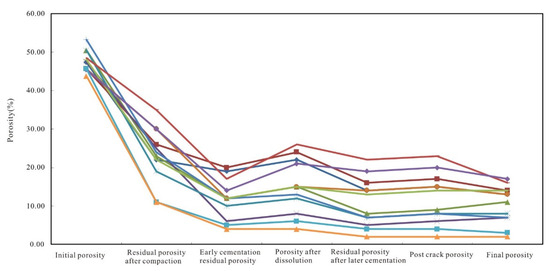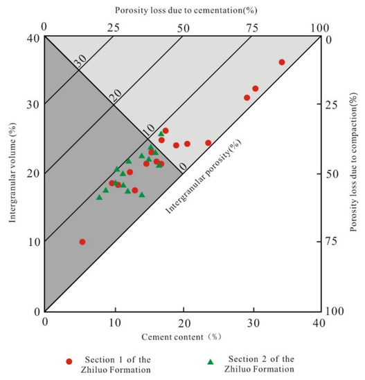 By quantitatively evaluating the loss of primary intergranular pores and the generation of secondary pores in sandstone at different diagenetic stages, a reasonable analysis of the evolution trend of the total porosity of sandstone was conducted, and the corresponding porosity evolution pattern diagram was drawn as follows (Figure 17 and Figure 18). It can be seen from the figure that compaction had the most destructive effect on the pores during late diagenesis in the study area, followed by early cementation, and later cementation had a relatively small impact. In addition, the formation of corrosion and later cracks caused corrosion pores, residual intergranular pores, and cracks to be important components of the current porosity. The relative specific gravity of the effects of compaction and cementation on the pores was evaluated by Housknechet [70]. Assuming that the original sandstone porosity was 40%, it can be seen from Figure 19 that the sandstone of the Zhiluo Formation in the study area is mainly compacted. Some samples from section 1 of the Zhiluo Formation are greatly affected by cementation, and the intergranular porosity of this section is smaller than that of section 2, indicating that the first section has been greatly affected by later diagenesis.
