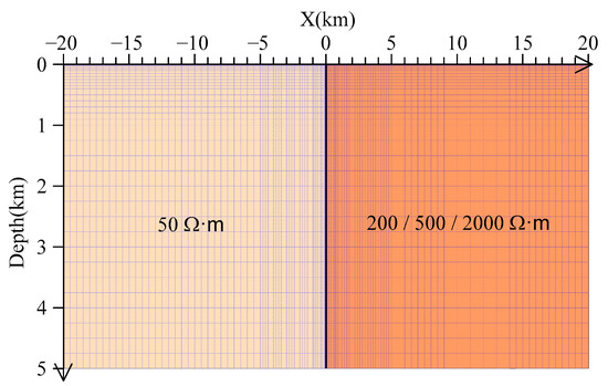 To quantitatively analyze the variation characteristics of the horizontal component of the magnetic field under the separated electric and magnetic channels mode, we employed the two-dimensional (2D) AMT finite-element method [46] for numerical simulation. The forward modeling involved the inhomogeneous geoelectric model and the water body model. We conducted respective simulations for each and analyzed the relative errors of the horizontal component of the magnetic field resulting from the separated electric and magnetic channels. The frequency range used for forward modeling was 0.35–10,400 Hz. In 2D cases, as the geological body is infinite along the strike direction, the magnetic field component in the horizontal direction remains constant. Therefore, we focus on discussing the horizontal component of the magnetic field in the dip direction of the geological body only.