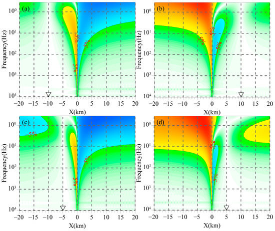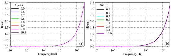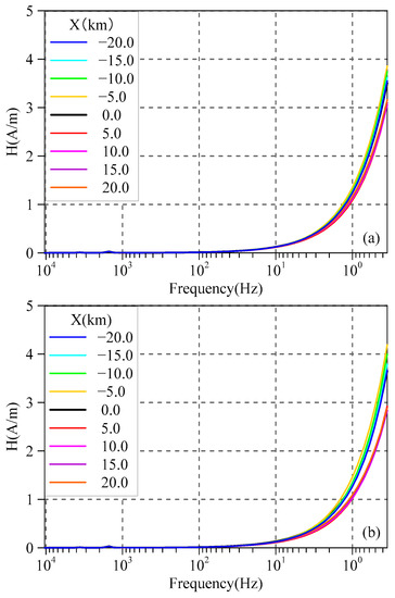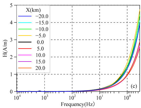 As Figure 2 shows, the magnetic fields of different geoelectric bodies on the profile increase with the decrease in frequency. The curves exhibit good agreement in the frequency range of 10–10,400 Hz, but gradually diverge at lower frequencies from approximately 10 Hz, with the differences becoming more pronounced as the frequency decreases. In high-resistivity regions, the magnetic field on the profile is lower than that at the interface, while it is the opposite in low-resistivity regions. Comparing Figure 2a–c, it can be seen that the greater the electrical difference between the media on two sides of the interface, the larger the magnetic field difference on the profile at lower frequencies.