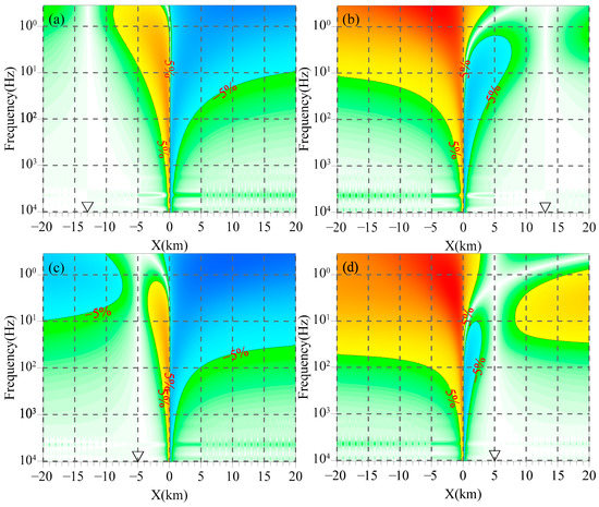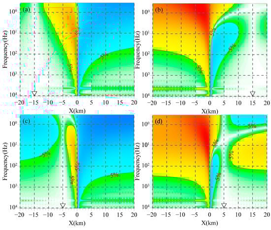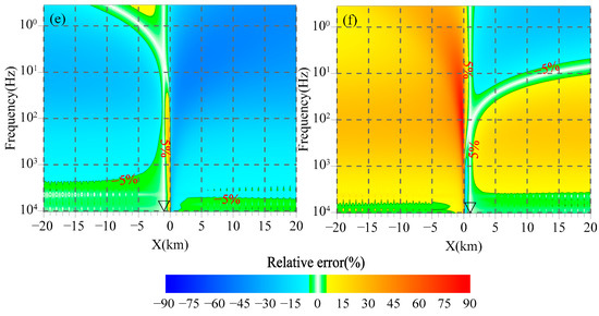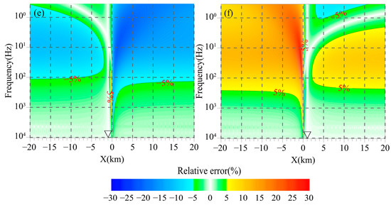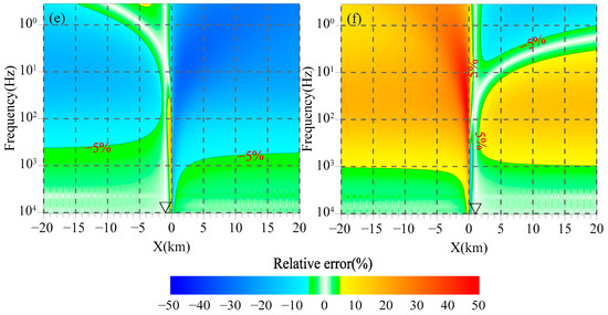 Figure 3, Figure 4 and Figure 5 illustrate the distribution of the relative error of the magnetic field with the frequency caused by replacing the magnetic field at the measuring point with that of the magnetic channel at different positions along the profile. In this study, we take 5% as the threshold value of the relative error, irrespective of its positive or negative sign. It can be seen from Figure 3, Figure 4 and Figure 5 that the relative errors of the magnetic field caused by electrical differences of geoelectric bodies are primarily concentrated in the middle-low frequency band and are distributed on both sides of the interface. When the magnetic channel and the measuring point are in the same geoelectric unit, the influence of electrical difference on the magnetic field becomes more complex. Specifically, between the measuring point and the interface, the relative error of the magnetic field exceeding 5% is primarily observed in the middle-low frequency band. As the magnetic channel approaches the interface, the effect gradually extends to the high-frequency band. On the opposite side of the measuring point, the relative error of the magnetic field is mainly concentrated in the low-frequency band. As the magnetic channel gradually moves away from the measuring point, the effect also extends to the high-frequency band. When the magnetic channel and the measuring point are in different geoelectric units, the relative error of the magnetic field consistently exceeds 5% in the low-frequency band, and the magnitude of the error increases as the frequency decreases. As the magnetic channel approaches the interface, the effect gradually extends to the high-frequency band. Comparing Figure 3a,c,e, it can be observed that as the measuring point approaches the interface, the frequency band where the relative error of the magnetic field exceeds 5% gradually expands from the low to high frequencies, which aligns with the frequency band in Figure 3b,d,f.
