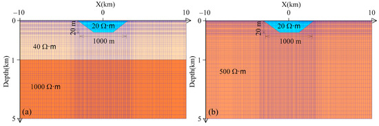Sketch map of different water body models. (a) In Model A, the water body is situated on sedimentary strata with a similar resistivity, and (b) in Model B, the water body is situated on bedrock with a significant resistivity difference. The light blue portion represents the water body, the orange portion represents strata with different resistivity, and the blue lines represent the forward mesh.