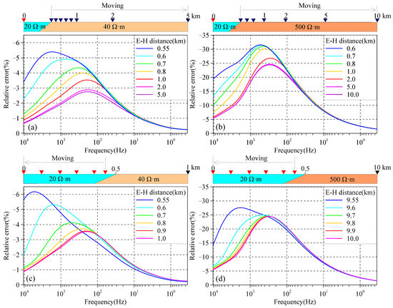For Model A, in Figure 8a, the measuring point is located at the center of the water area, and the magnetic channel gradually moves from the shore, increasing the distance between the separated electric and magnetic channels. When the magnetic channel is 0.05 km away from the shore, the distance between the separated electric and magnetic channels is 0.55 km, and the relative error of the magnetic field slightly exceeds 5% in the frequency band around 1 k–4 k Hz. As the magnetic channel continues to move away from the shore, the distance between the separated electric and magnetic channels increases, leading to a decrease in the relative error, and the main part moves from the high-frequency band to the middle-frequency band. When the magnetic channel is 4.5 km away from the shore, the distance between the separated electric and magnetic channels is 5.0 km, and the relative error of the magnetic field tends to stabilize (<3%). In Figure 8c, with the magnetic channel fixed at 1.0 km, the measuring point over the water gradually approaches the water’s center from the shore, increasing the distance between the separated electric and magnetic channels. When the measuring point over the water is within 0.1 km from the shore, the distance between the separated electric and magnetic channels is less than 0.6 km, and the relative error of the local frequency band above 1 k Hz exceeds 5%. As the measuring point moves towards the water’s center, the distance between the separated electric and magnetic channels gradually increases, leading to a decrease in the relative error of the magnetic field, and the main part moves from the high-frequency band to the middle-frequency band. When the measuring point is 0.5 km away from the shore, the distance between the separated electric and magnetic channels is 1.0 km, and the relative error of the magnetic field tends to stabilize (<3%). From the above analysis, it is evident that whether the measuring point or the magnetic channel is close to the shore, the relative error of the magnetic field between the magnetic channel and the measuring point increases, indicating that the electrical difference between the media on both sides of the shore is the primary factor causing the magnetic field difference.