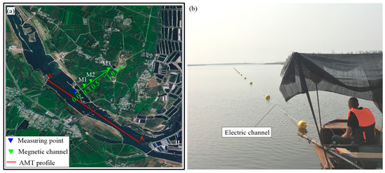 AMT observation experiment using separated electric and magnetic channels in a river in Liaoning province, China: (a) the work area and (b) the electric channel arrangement in the river.
