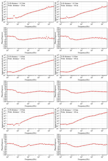 Apparent resistivity and impedance phase curves of AMT at different magnetic channel sites on the shore. The E-H distance represents the distance between the separated electric and magnetic channels.