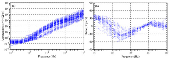 (a) Apparent resistivity and (b) impedance phase curves of the AMT test profile in the river.