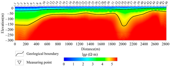 After editing the AMT data, we employed the 2D inversion software SCS2D (Zonge Engineering and Research Organization Inc., Tucson, AZ, USA) for profile inversion. The initial model used was a uniform half-space model with a resistivity of 100 Ω∙m. The top layer had a thickness of 5.0 m, and the row-to-row thickness multiplier was set to 1.25. A total of 20 layers were used, and the 2D moving-average filter parameter was set to 0.5. The maximum iteration was set to 20, and the error floor was 5% for the apparent resistivity and 50 milliradians for the impedance phase. The inversion frequency range was 1.0–10,400 Hz. Figure 12 displays the inversion results of the AMT test profile with transverse magnetic (TM) mode. The resistivity pseudo-section exhibits a “low–middle–high” characteristic from the surface. Based on the geological and petrophysical analysis of the study area, we conducted a preliminary interpretation of the inversion results. We identified three layers: the surface layer, which consists of salinized water, water-bearing silt, and sand gravel with a thickness of approximately 15–40 m; the middle layer, which is composed of gneiss with a thickness of approximately 25–120 m; and the deep layer, which is the granitic bedrock, being deeper in the east and shallower in the west, with the top depth of approximately 30–150 m.