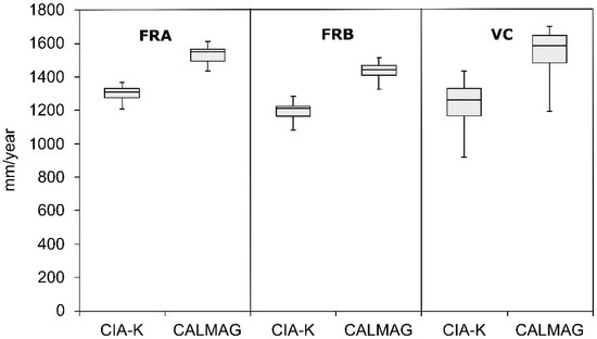 | Samples | CIA (%) | CIA-K (%) | MAP-CIA-K (mm/year) | CALMAG (%) | MAP-CALMAG (mm/year) |
