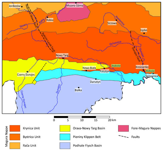 The Outer Carpathian flysch is divided into several nappes and thrust sheets: the Magura Nappe, Fore-Magura group of nappes, and the Dukla, Silesian, Subsilesian, and Skole nappes (Figure 2). The southern large Magura Nappe is divided into four lithostratigraphic-tectonic units: Krynica, Bystrica, Rača, and Siary. All these units are built mainly of Lower Cretaceous to Oligocene flysch rocks. The southernmost Krynica Unit borders the PKB. The northern Outer Carpathian nappes built of Upper Jurassic to Lower Miocene flysch sequences are covered by the Magura Nappe in the research area. They are exposed only in the Mszana tectonic window. The North European Platform consists of the Precambrian crystalline basement and the Paleozoic-Miocene sedimentary cover [1,24]. The rocks of the Magura nappe are cut by several deep faults perpendicular to the strike of the nappe [25]. The Miocene andesitic dykes and sills are located near the PKB-Magura Nappe border (Figure 2). Intrusions cut through the Magura Nappe and the PKB form andesitic dykes and sills distributed along the Pieniny Andesitic Line (PAL) [22,26,27]. The sediments that form the Outer Carpathian nappes were originally deposited in the Mesozoic and Cenozoic basins belonging to the western part of the Tethyan realm [23,24]. The evolutionary stages of these basins include: