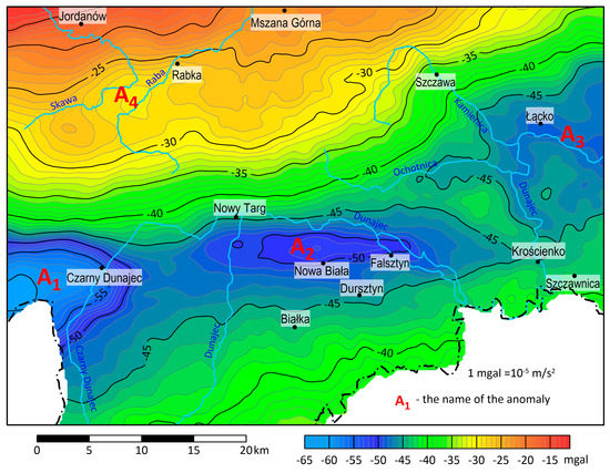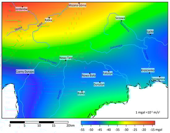 In gravimetric studies, Bouguer anomalies are the basis for the interpretation of the geological structure of the rock. For their correct calculation, it is necessary to introduce the Bouguer reduction into the measured values of gravity. According to formula (1), the reduction consists of several individual corrections. One of them is the Bouguer correction, whose value depends on the average bulk density of the formations that form the near-surface part of the rock sequence. In calculations for areas with a large horizontal extent, the average density of the earth’s crust is usually used, which is 2.67 g·cm−3. However, taking into account the fact that the entire study area is made of Carpathian flysch, its average bulk density was used for the calculations [36]. Analyzing the range of density variability in individual units of the Western Flysch Carpathians [37] and data from boreholes [38], the average density of the Carpathian flysch was assumed to be 2.5 g·cm−3 for the calculations of the Bouguer correction. Due to the mountainous nature of the study area, it was necessary to take into account the second correction, the terrain correction, in the calculations of the Bouguer anomaly. Since this correction also requires an a priori value of the mean density of near-surface rocks, its value was the same as in the case of the Bouguer correction, i.e., 2.5 g·cm−3. Terrain correction was calculated within a radius of 20 km around the gravimetric measurement point based on the DEM (Digital Elevation Model), with a resolution of 25 m × 25 m, downloaded from the Copernicus portal, which is part of the European Union’s Space Programme. Taking into account all necessary corrections, it was possible to calculate the value of the Bouguer anomaly (Figure 3).