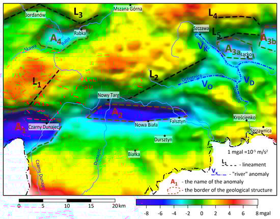 Separation of the fields allowed us to obtain a more accurate picture of anomaly A3, which was previously seen on the distribution of Bouguer anomalies (Figure 3). This anomaly, or rather an anomalous region with relatively negative values, has a much more complicated shape than anomalies A1 and A2. Above the village of Łącko, a negative anomaly A3a is visible, which cannot be correlated with the Dunajec River. Furthermore, there was a negative anomaly A3b, which has clear boundaries that may correspond to faults.