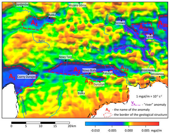 The decomposition of the vertical gravity derivative confirms the existence of the previously discussed anomalies A3a and A3b. On the other hand, Rabka Basin A4 is less visible, indicating the small thickness of the formations that fill it. The previously isolated anomalies of VD, VK, and VO are clearly visible. The distribution of the vertical derivative confirms that they are undoubtedly associated with river valleys and most likely that they originate from light alluvial formations.