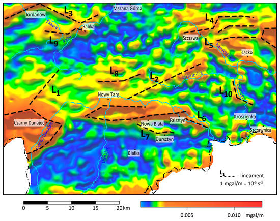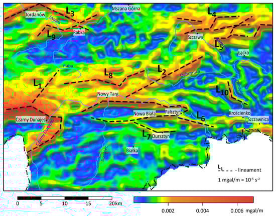 Lineaments contouring the boundaries of the Orava Basin and the Nowy Targ Basin are well visible. To the south of the latter, lineaments L6 and L7 were identified. Lineament L6 marks the southern boundary of the structure, with reduced density A2a recorded in the distribution of the vertical derivative, and lineament L7 marks the southern boundary of the structure A2b (Figure 6).