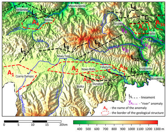 The faults shown in Figure 2 are completely invisible, except for a fragment of the Dunajec fault (the lineament L10). A group of lineaments L4 and L5 are generally known, but other lineaments were discovered during this research. Some of these lineaments may be the result of deeper subsurface faults, particularly L1 and L2. A confirmation of all lineaments is possible by seismic research.