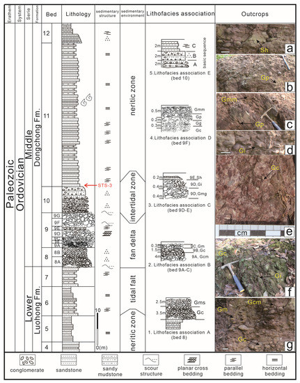 Based on our investigations, in the conglomerate layer of Beds 8–10 at the top of Shita Mountain, 12 types of lithofacies could be identified (Table 1), which could be classified into 5 types of lithofacies associations (Figure 4), as described in detail below.
