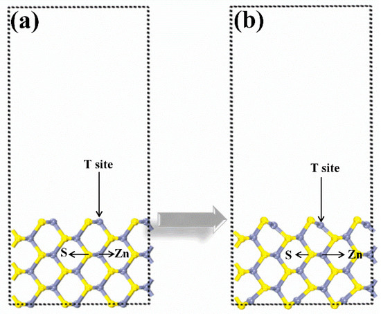 The sphalerite (110) surface was reported to be the most stable surface in thermodynamics [24,25,26]. Therefore, the slab model of the (110) crystal surface was cut out and finally amplified into a 3×2×1 supercell model. Then, a slab model of sphalerite (110) surface with three layers of thickness and 25 Å vacuum layer was constructed. As is shown in Figure 1, the slab model of sphalerite (110) surface has obvious relaxation, and sulfur sites in the surface are more prominent after optimization. The water molecule and the structures of hydroxylation and hydration of the Zn ion were pre-optimized in a cubic cell of 20 × 20 × 20 Å3 using the k-point of Gamma. For the surface model calculation, k-point was set as 2 × 2 × 1. The configurations of valence electrons of Zn, S, H, and O were performed as 3d104s2, 3s23p4, H-1s1, and O-2s22p4, respectively.