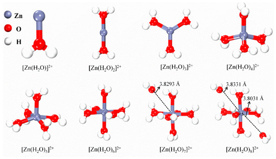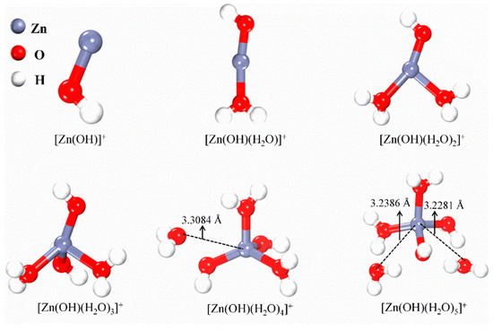 According to the chemical theory of flotation solution, there are three main components of the Zn ion in the neutral solution, including Zn2+, [Zn(OH)]+, and Zn(OH)2 [6,29]. In addition, the flotation process is carried out in an aqueous environment, where zinc ions coordinate with water molecules to form a hydrated structure. The hydration structure of Zn2+, [Zn(OH)]+ and Zn(OH)2 should have the corresponding most stable configuration, so it is necessary to study these most stable hydration structures first.