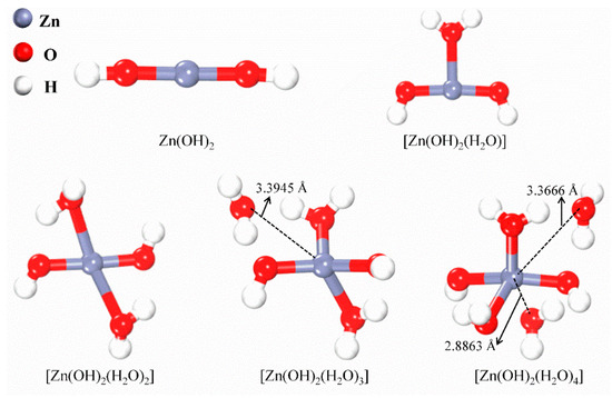 Under high alkalinity conditions, zinc ions mainly exist in the form of Zn (OH) 2. In fact, under neutral conditions, Zn (OH)2 is also one of the main components of zinc ions. It can be seen from Table S2 that the ΔEad is also gradually decreased when the number of H2O ligands increase from one to four. As shown in Figure 4, Zn(OH)2 can adsorb two water molecules at most. When water molecules continue to be adsorbed on [Zn(OH)2(H2O)2], the distance between the Zn atom and the O atom in the third water is much greater than the distance between the initial two water molecules and the zinc atom. When the fourth water molecule continues to be adsorbed on [Zn(OH)2(H2O)3], the water molecule will also be far away from the zinc atom, indicating that the most stable hydration configuration of Zn(OH)2 is [Zn(OH)2(H2O)2].
