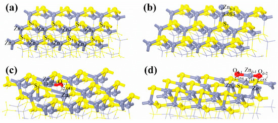 In order to better understand the effect of hydration of Zn ions on mineral surface adsorption, the adsorption configurations of Zn ions without and with hydration are shown in Figure 5 and Figure 6, respectively. The corresponding adsorption energy values of Zn2+, [Zn(OH)]+, and [Zn(OH)2] on the sphalerite (110) surface are presented in Table S3. Figure 5a gives a sphalerite (110) surface view. The S and Zn atoms at the top position have unsaturated residual bonding abilities. As shown in Figure 5b, Zn2+ is adsorbed on the S7 site in the mineral surface with a distance of 3.084 Å between the Znb-1 and S7 atoms, and their adsorption energy is −17.4 kJ/mol, which indicates that the Zn atom is not sulfophilic [34]. Figure 5c shows the adsorption configuration of [Zn(OH)]+. The [Zn(OH)]+ is adsorbed on the sphalerite through the Znc-1–S5 and Oc-1–Zn6 bonds. The corresponding bond lengths of Znc-1–S5 and Oc-1–Zn6 are 2.108 and 2.043 Å, respectively. The adsorption energy of [Zn(OH)]+ on the sphalerite (110) surface is −158.6 kJ/mol. As presented in Figure 5d, the adsorbate of [Zn(OH)2] will interact with Zn6, Zn5, and S5 atoms on the sphalerite (110) surface to form Od-1–Zn6, Od-2–Zn5, and Znd-1–S5 bonds. The bond lengths of Od-1–Zn6, Od-2–Zn5, and Znd-1–S5 are 2.056, 2.055, and 3.718 Å, respectively. In addition, the adsorption energy of [Zn(OH)2] on the sphalerite (110) surface is −231.0 kJ/mol.