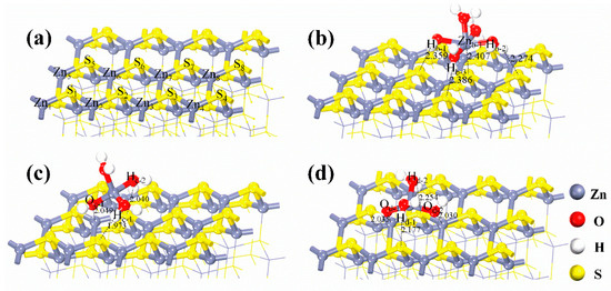 (a) Sphalerite (110) surface view; (b) [Zn(H2O)5]2+ adsorption configuration, (c) [Zn(OH)(H2O)3]+ adsorption configuration, and (d) [Zn(OH)2(H2O)2] adsorption configuration on sphalerite (110) surface.