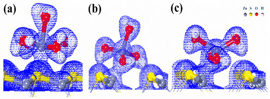 Electron density of different adsorbates adsorbed on the surface of sphalerite: (a) [Zn(H2O)5]2+, (b) [Zn(OH)(H2O)3]+, (c) [Zn(OH)2(H2O)2] (isovalue = 0.25).