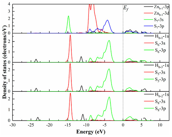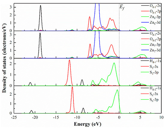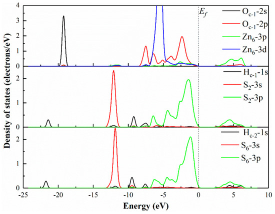 In order to further explain the mechanism of hydrated Zn ions on the surface of sphalerite, PDOSs of bonding atoms after the adsorption of hydrated Zn ion are performed, with the results presented in Figure 8, Figure 9 and Figure 10. The Fermi level’s position is set to 0 eV. Significant chemical processes are usually reflected near the Fermi level.