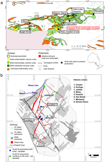 The present contribution explores the above issues by evaluating Au-Bi-Te(-Cu) assemblages in the orogenic Wawa Gold Corridor (WGC) in the Archean Michipicoten greenstone belt (MGB) of the Superior province, Canada. A previous study [35] determined that two principal Au events occurred in this system. The first is characterized by gold associated with arsenopyrite and pyrite hosted in quartz + carbonate + phyllosilicate schists and quartz veins, whereas the second is characterized by gold associated with Bi-Te minerals and chalcopyrite hosted in late, crosscutting, siderite–sulphide veinlets. The WGC therefore represents an excellent environment in which to investigate the nature and relevance of Bi-rich polymetallic melts in orogenic deposits and, as such, this study aims to assess: (1) whether or not Bi-rich melts existed and were responsible for depositing gold; (2) the physicochemical conditions under which any such melts originated and evolved; and (3) the relationship, if any, between Au-Bi-Te(-Cu) mineralization and magmatic–hydrothermal activity.